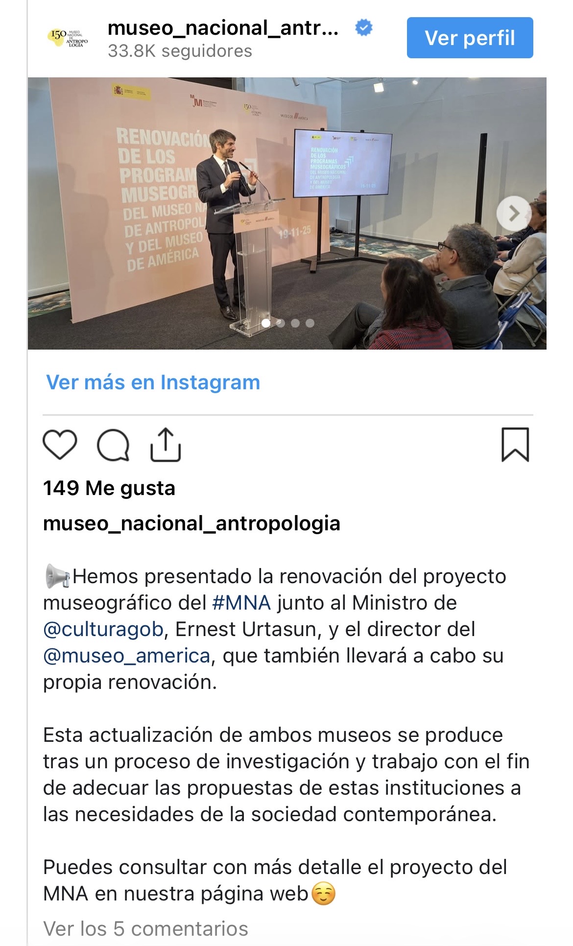 Este miércoles, en rueda de prensa llevada a cabo en el Museo Nacional de Antropología,la directora general de Bellas Artes y Patrimonio del Ministerio de Cultura de España, presentó los programas museográficos para la renovación de las exposiciones permanentes tanto de esa institución como del Museo Nacional de América, ubicado también en Madrid.