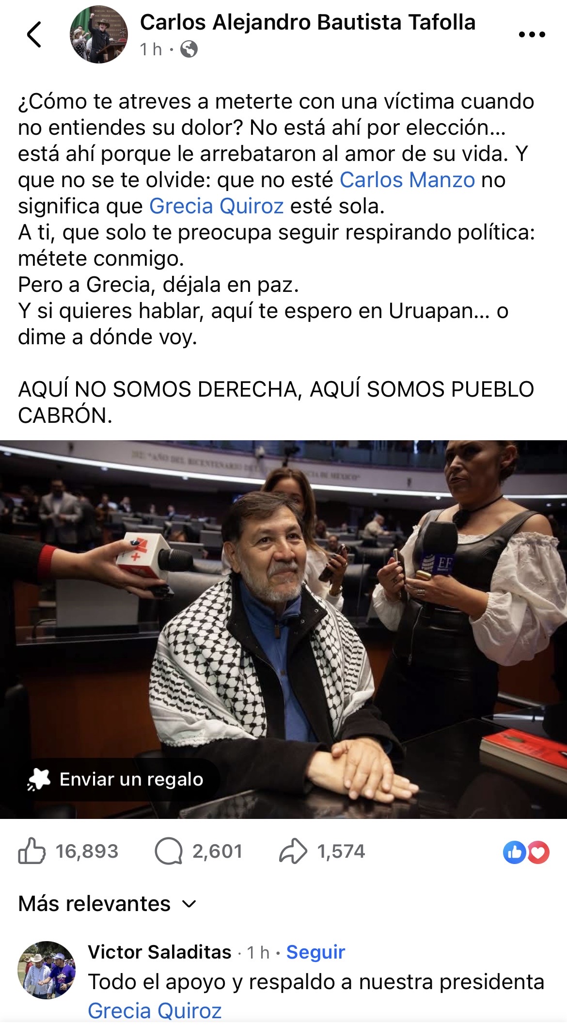 “¿Cómo te atreves a meterte con una víctima cuando no entiendes su dolor? No está ahí por elección… está ahí porque le arrebataron al amor de su vida. Y que no se te olvide: que no esté Carlos Manzo no significa que Grecia Quiroz esté sola.”, escribió Bautista Tafolla en sus redes sociales.