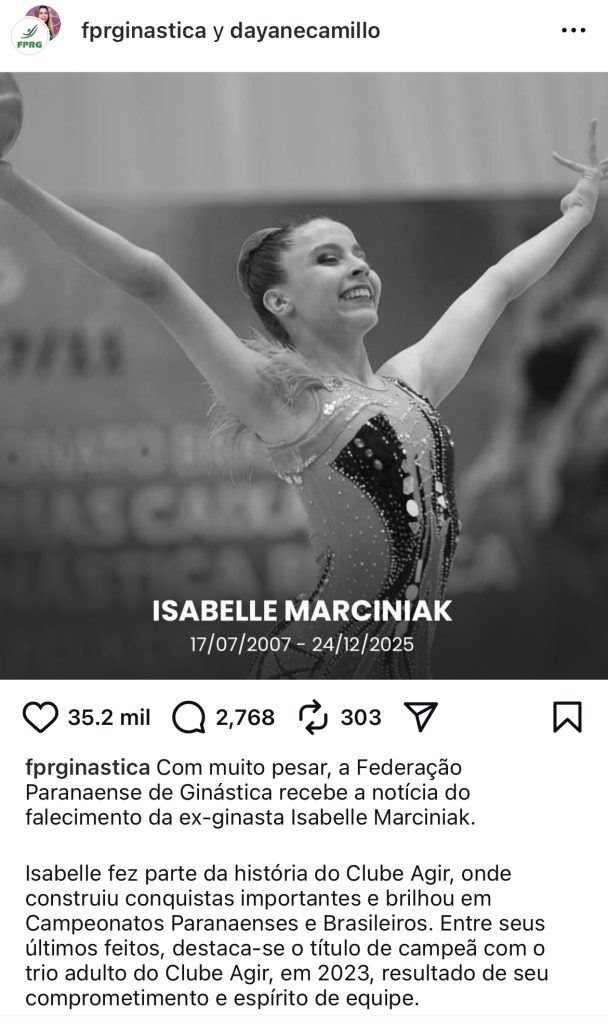 La Federación Paranaense de Gimnasia expresó, “en este momento de dolor”, su solidaridad con familiares, amigos, compañeras de equipo, entrenadores y toda la comunidad de la gimnasia.