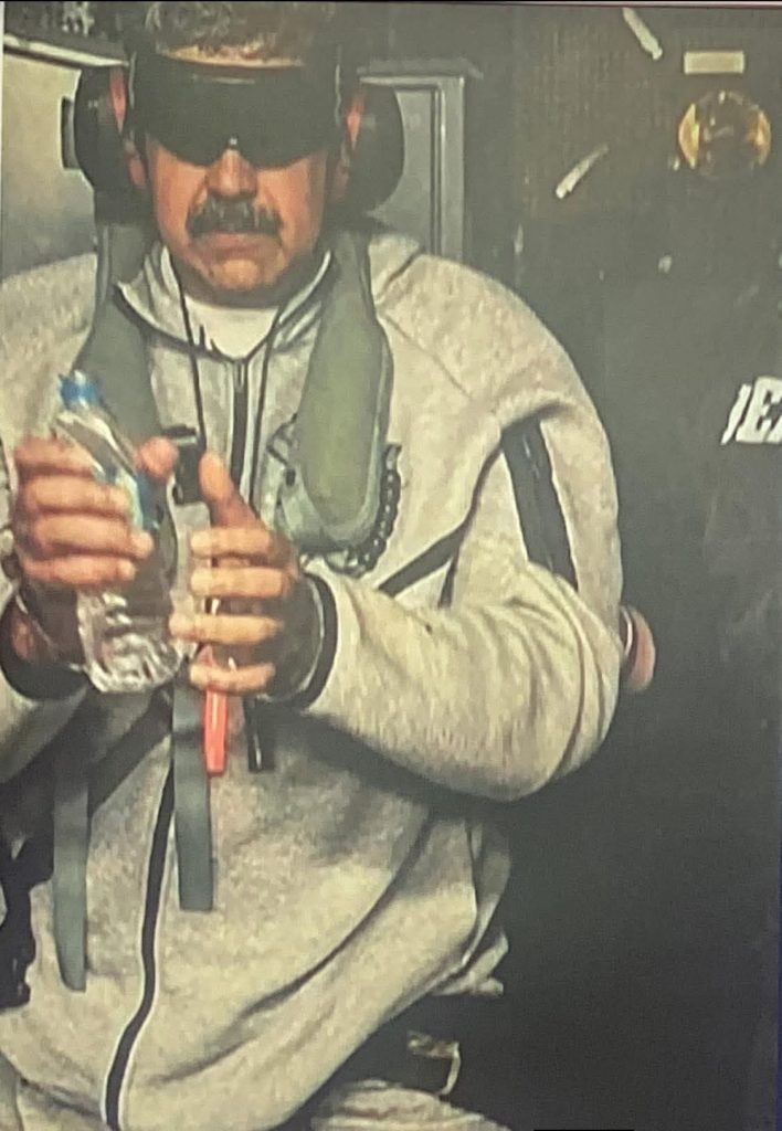 A través de su red social Truth Social, el mandatario compartió una fotografía en la que se observa a Maduro con los ojos tapados, audífonos de cancelación de ruido y una botella de agua en su mano izquierda.