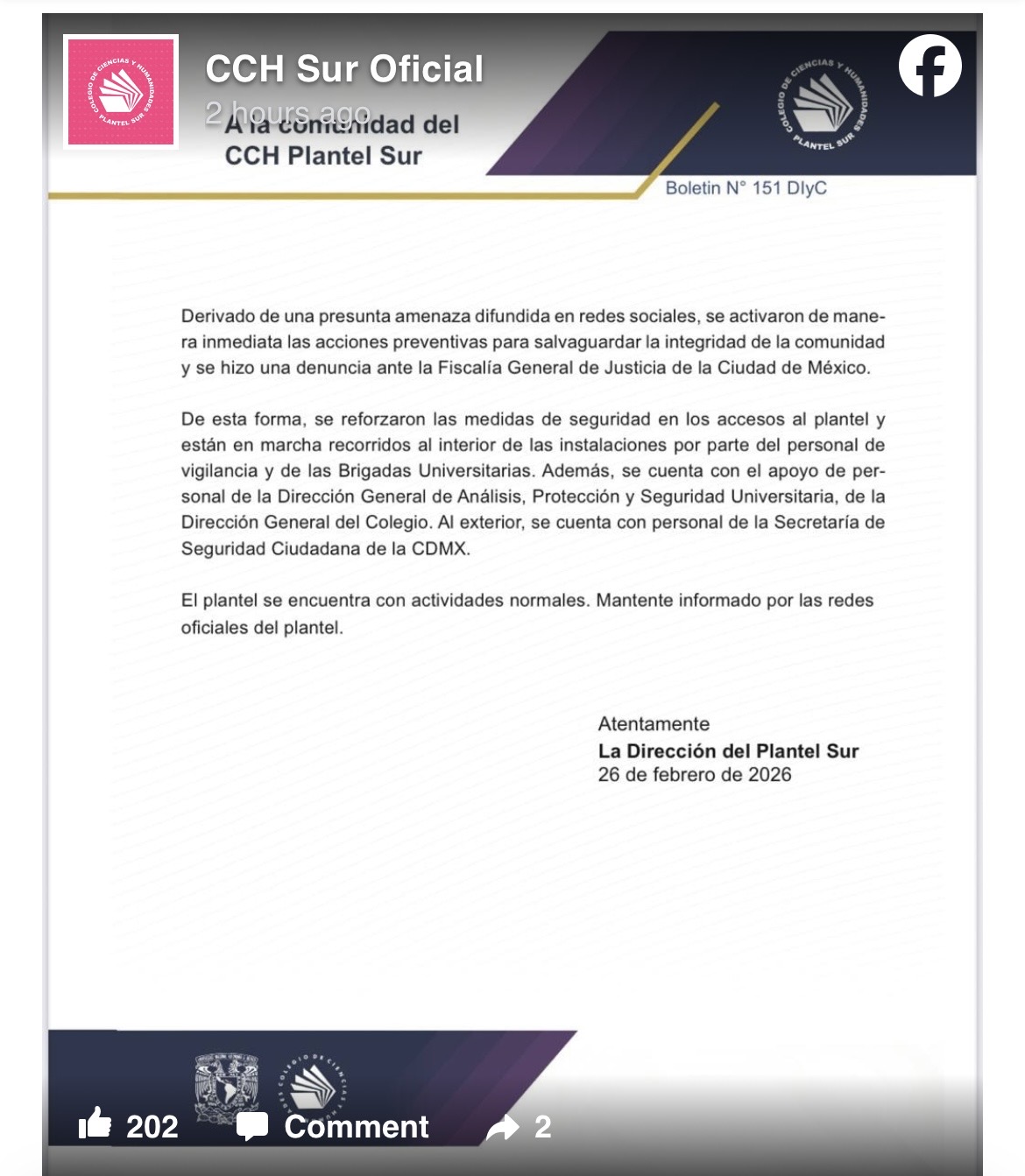 El Colegio de Ciencias y Humanidades en su plantel Sur (CCH Sur) informó este jueves que se reforzaron las medidas de seguridad después de una presunta amenaza de agresión que se difundió en redes sociales.