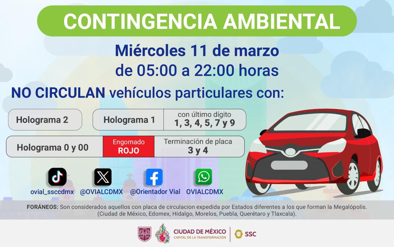 Por lo anterior, se informó que los vehículos con holograma de verificación 0 y 00, engomado rojo, terminación de placa 3 o 4, así como vehículos de uso particular con holograma de verificación 1, cuyo último dígito numérico sea 1, 3, 4, 5, 7 y 9 y todos los vehículos con verificación 2, no podrán circular en un horario de las 5:00 de la mañana a las 10:00 de la noche.