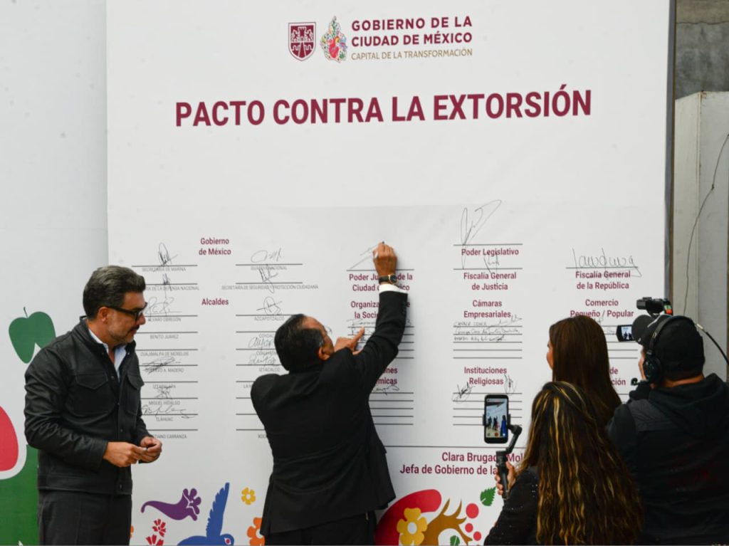 PJCDMX firma el Pacto contra la Extorsión, iniciativa impulsada por la Jefa de Gobierno, Clara Brugada, que suma a cámaras de comercio, organizaciones de la sociedad civil, representantes religiosos e instituciones académicas.