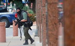 Paneles de las ventanas en la puerta giratoria y dos laterales de la entrada de Commerce Street fueron destruidas por los disparos, aunque se desconoce si fueron lanzados por el tirador enmascarado o por los policías.