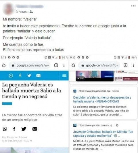 La publicación es la siguiente: “Te invito a hacer este experimento. Escribe tu nombre en Google junto a la palabra ‘hallada’ y dale buscar. Por ejemplo ‘Andrea hallada’. Me cuentas cómo te fue. El feminismo nos representa a todas”, se lee.