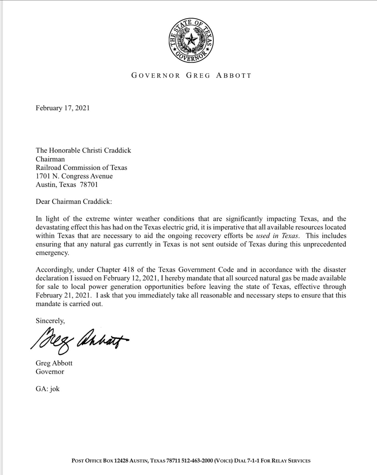 Greg Abbott, gobernador del estado de Texas, dio a conocer en conferencia de prensa, realizada el miércoles 17 de febrero de 2021, que emitió una orden que obliga a los productores de gas natural a vender solamente a empresas eléctricas de Texas y no al extranjero hasta el próximo 21 de febrero.