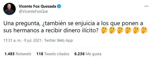 Tras el videoescándalo, el expresidente Vicente Fox cuestionó en redes sociales si también se enjuicia a los que ponen a sus hermanos a recibir dinero ilícito.