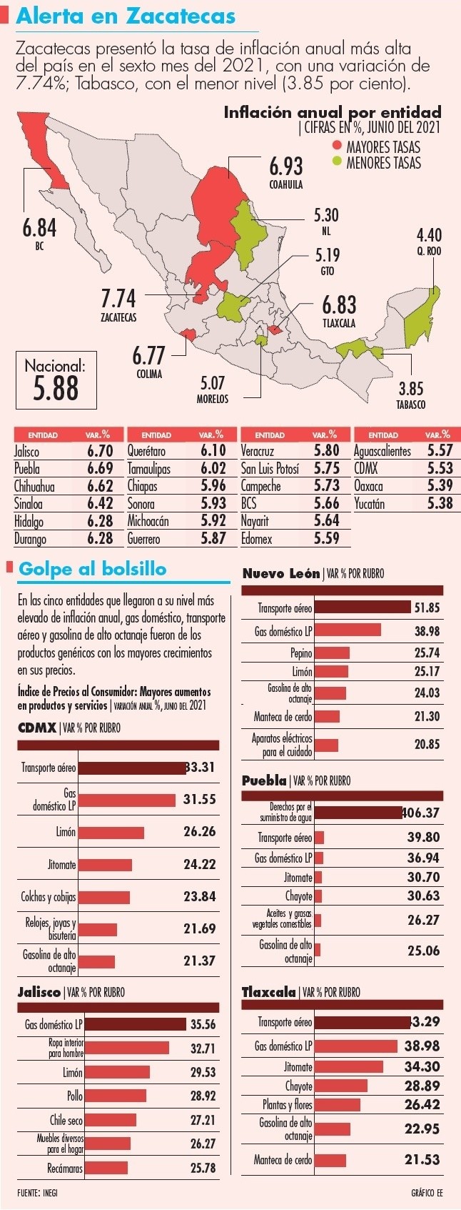 Por entidad, los mayores incrementos anuales en los precios al consumidor durante junio se registraron en Zacatecas (7.74% anual), Coahuila (6.93%) y Baja California (6.84%),mientras las tasas más bajas fueron en Morelos (5.07%), Quintana Roo (4.40%) y Tabasco (3.85 por ciento).