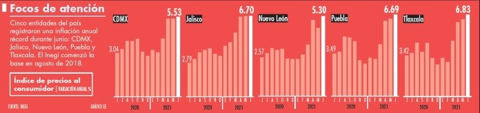 Durante junio de este año, cinco entidades del país registraron cifras récord en su nivel de inflación anual: Ciudad de México, Nuevo León, Jalisco, Puebla y Tlaxcala.