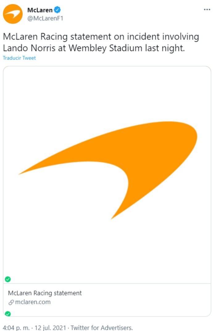 “McLaren Racing puede confirmar que Lando Norris estuvo implicado en un incidente después de la final de la Eurocopa 2020 en Wembley, durante el que se le sustrajo el reloj que llevaba”, hizo saber la escudería británica el lunes en un comunicado.