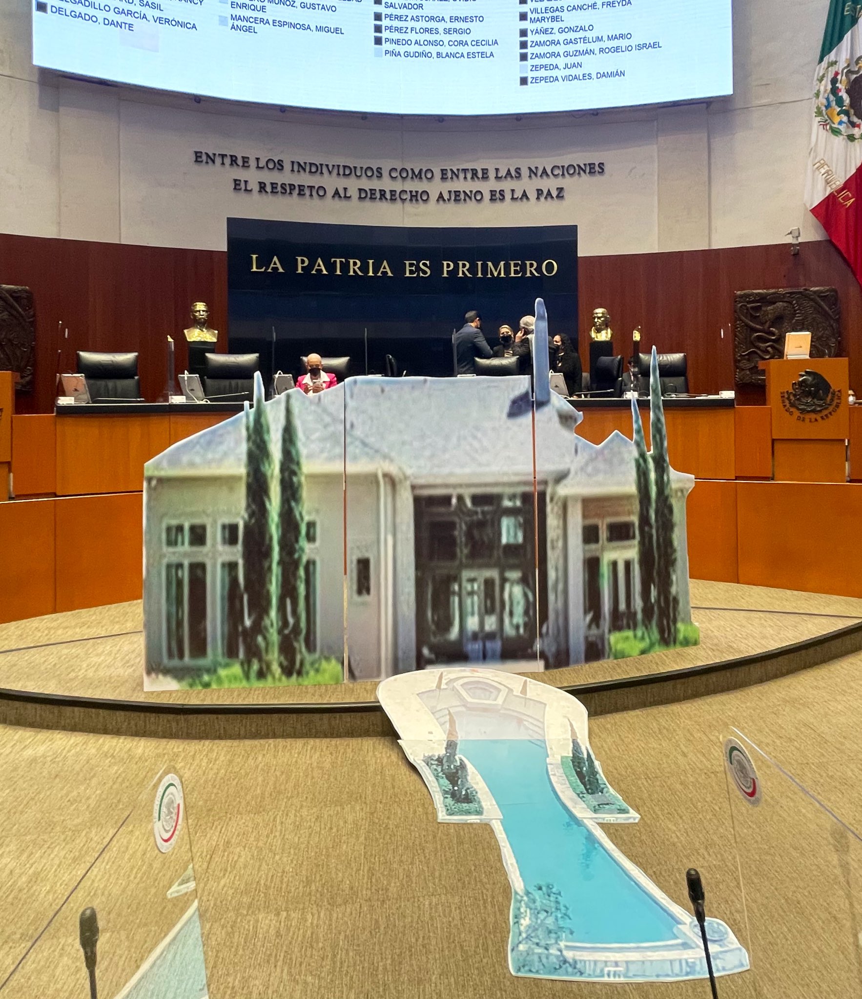 Los senadores de la bancada de Acción Nacional (PAN), encabezada por Julen Rementería del Puerto, instalaron una réplica de la casa lujosa donde vivió José Ramón Lopez Beltran, hijo del Presidente Andrés Manuel López Obrador, en Houston, Texas.