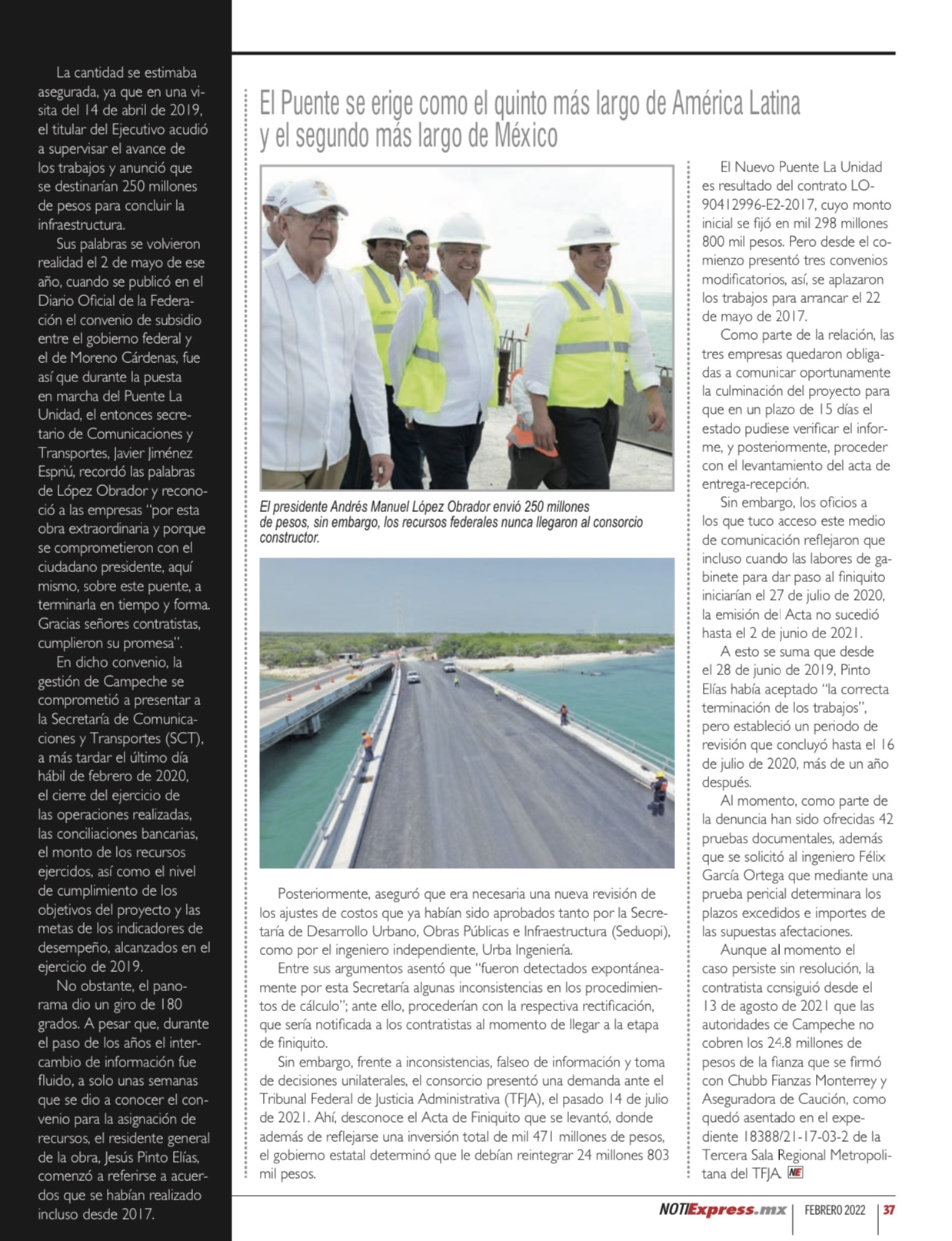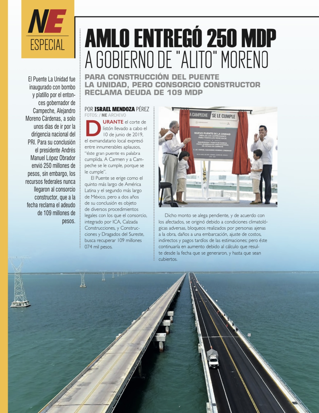 El Puente La Unidad fue inaugurado con bombo y platillo por el entonces gobernador de Campeche, Alejandro Moreno Cárdenas, a solo unos días de ir por la dirigencia nacional del PRI. Para su conclusión el presidente Andrés Manuel López Obrador envió 250 millones de pesos, sin embargo, los recursos federales nunca llegaron al consorcio constructor, que a la fecha reclama el adeudo de 109 millones de pesos.