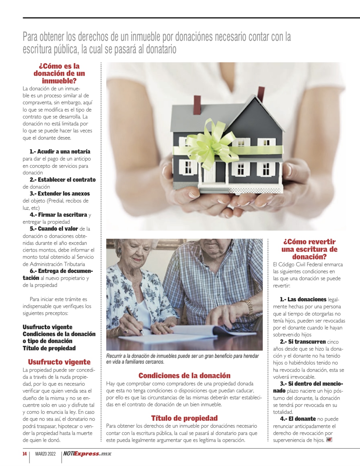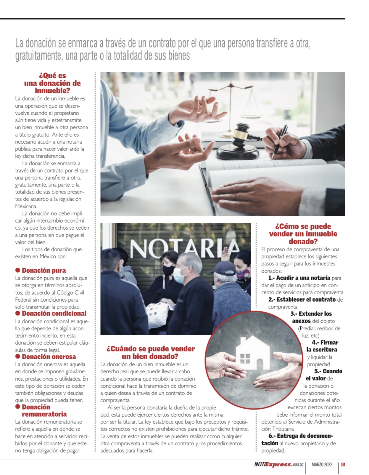 La donación de un inmueble es una operación que se desenvuelve cuando el propietario aún tiene vida y estetransmite un bien inmueble a otra persona a título gratuito. Ante ello es necesario acudir a una notaria pública para hacer valer ante la ley dicha transferencia.