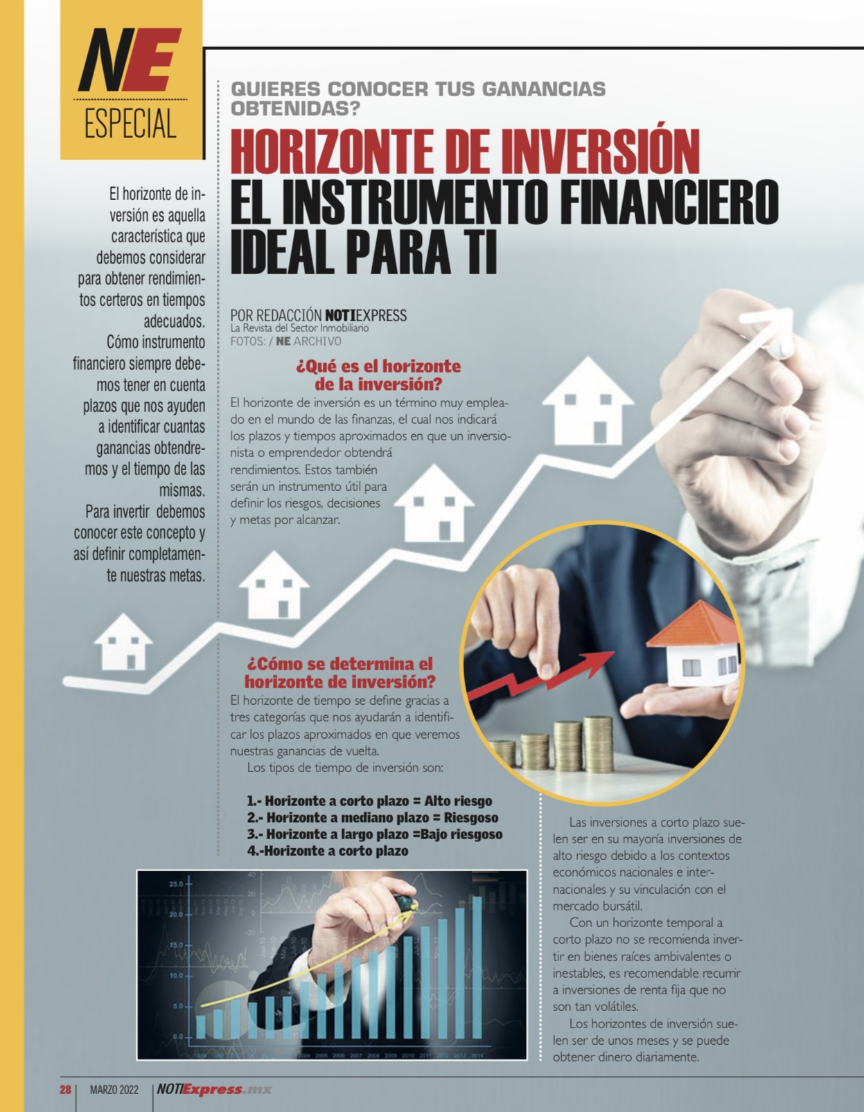 Por otra parte, es importante mencionar que invertir en bienes raíces es una de las alternativas más confiables, ya que las propiedades jamás se devalúan y al contrario aumentan su plusvalía conforme a los años.Te recomendamos acercarte con un y de inversión en los mercados para que puedas conocer las opciones que existen para ti.Horizonte de inversión en el sector inmobiliarioLas inversiones a corto, mediano o largo plazo serán lo que determinen el regreso de tus ganancias en tiempos que puedan acomodarse a tus expectativas; en el sector inmobiliario no es la excepción y ante cualquier adquisición de una propiedad debes tener en cuenta dichos conceptos para así tomar decisiones adecuadas.Por otra parte, es importante mencionar que invertir en bienes raíces es una de las alternativas más confiables, ya que las propiedades jamás se devalúan y al contrario aumentan su plusvalía conforme a los años.Te recomendamos acercarte con un broker inmobiliario y de inversión en los mercados para que puedas conocer las opciones que existen para ti.