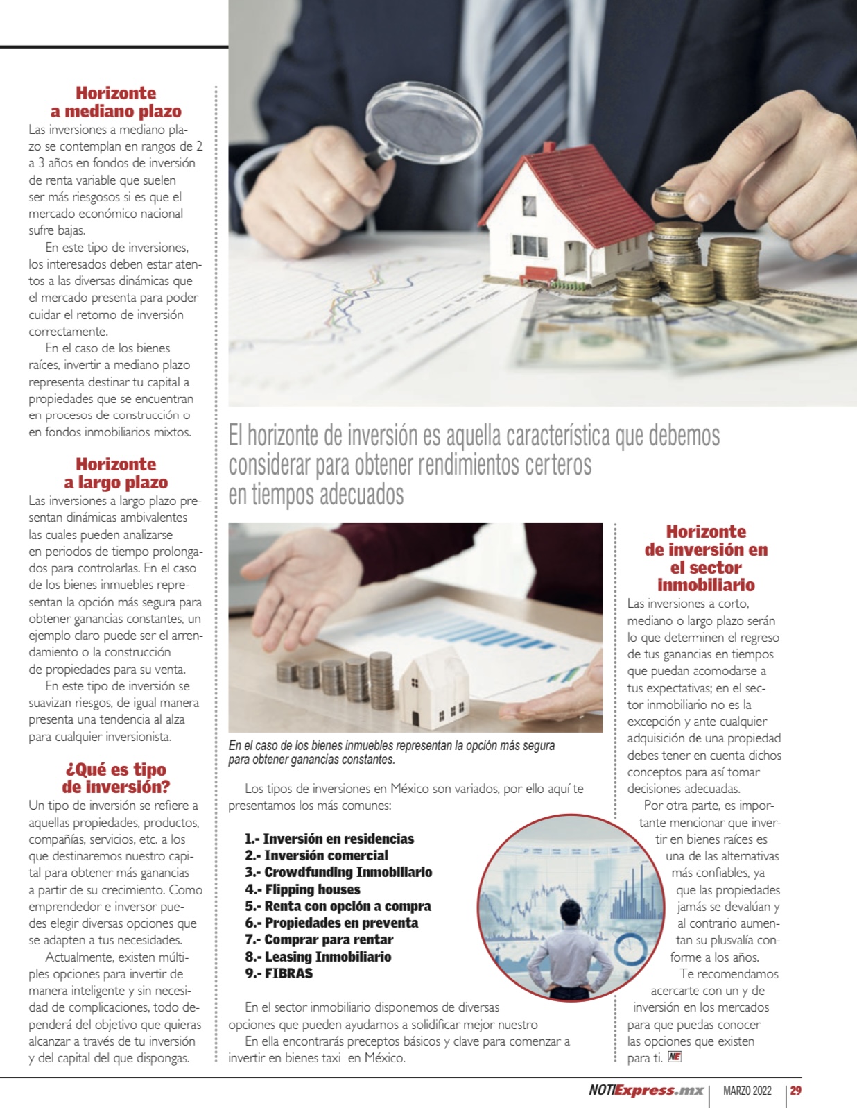 En este tipo de inversiones, los interesados deben estar atentos a las diversas dinámicas que el mercado presenta para poder cuidar el retorno de inversión correctamente.En el caso de los bienes raíces, invertir a mediano plazo representa destinar tu capital a propiedades que se encuentran en procesos de construcción o en fondos inmobiliarios mixtos.Horizonte a largo plazoLas inversiones a largo plazo presentan dinámicas ambivalentes las cuales pueden analizarse en periodos de tiempo prolongados para controlarlas.En el caso de los bienes inmuebles representan la opción más segura para obtener ganancias constantes, un ejemplo claro puede ser el arrendamiento o la construcción de propiedades para su venta.En este tipo de inversión se suavizan riesgos, de igual manera presenta una tendencia al alza para cualquier inversionista.¿Qué es tipo de inversión?Un tipo de inversión se refiere a aquellas propiedades, productos, compañías, servicios, etc. a los que destinaremos nuestro capital para obtener más ganancias a partir de su crecimiento. Como emprendedor e inversor puedes elegir diversas opciones que se adapten a tus necesidades.Actualmente, existen múltiples opciones para invertir de manera inteligente y sin necesidad de complicaciones, todo dependerá del objetivo que quieras alcanzar a través de tu inversión y del capital del que dispongas.Los tipos de inversiones en México son variados, por ello aquí te presentamos los más comunes: Inversión en residencias inversion comercial Crowdfunding inmobiliario Flipping houses Renta con opción a compra propiedades en preventa Comprar para rentar Leasing Inmobiliario FIBRAS En el sector inmobiliario disponemos de diversas opciones que pueden ayudarnos a solidificar mejor nuestro En ella encontrarás preceptos básicos y clave para comenzar a invertir en bienes taxi en México.Horizonte de inversión en el sector inmobiliarioLas inversiones a corto, mediano o largo plazo serán lo que determinen el regreso de tus ganancias en tiempos que puedan acomodarse a tus expectativas; en el sector inmobiliario no es la excepción y ante cualquier adquisición de una propiedad debes tener en cuenta dichos conceptos para así tomar decisiones adecuadas.