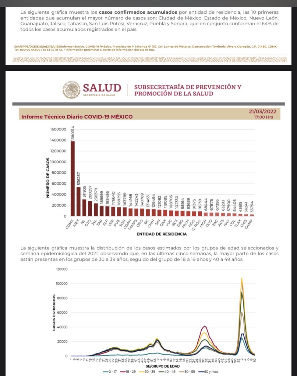 México reportó este lunes 15 nuevas muertes y 671 contagios por el COVID-19, con lo que totaliza cinco millones 635 mil 500 casos y acumula 322 mil 107 decesos en total, informó la Secretaría de Salud.