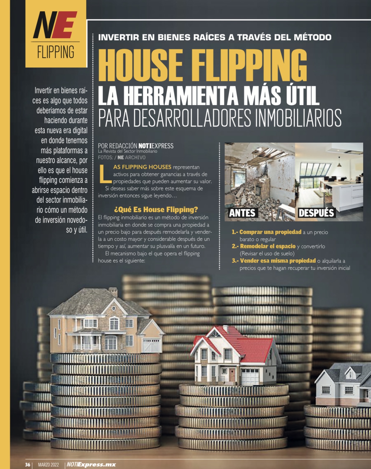 El flipping inmobiliario es un método de inversión inmobiliaria en donde se compra una propiedad a un precio bajo para después remodelarla y venderla a un costo mayor y considerable después de un tiempo y así,aumentar su plusvalía en un futuro.