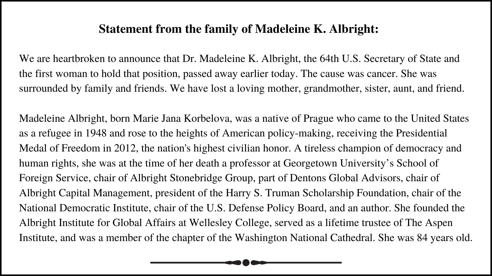 “Hemos perdido a una madre cariñosa, a una abuela, una hermana, una tía y una amiga”, afirmó la familia de Albright, que tuvo tres hijas con el magnate de la prensa norteamericana, Joseph Albright, del que posteriormente se divorció, aunque conservó su apellido.
