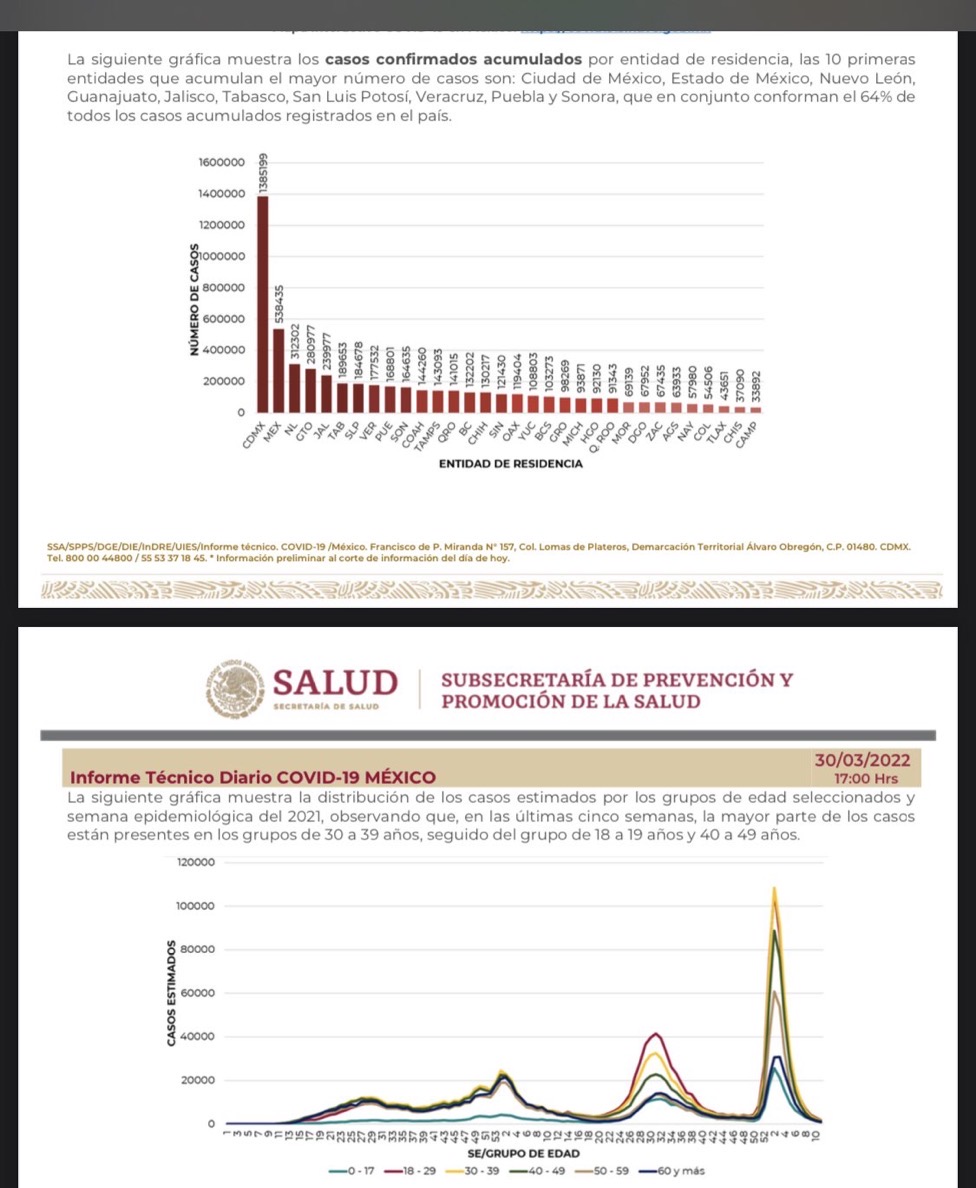 México reportó este miércoles 103 nuevas muertes y dos mil 766 contagios por COVID-19, con lo que totaliza cinco millones 657 mil 077 casos y acumula 322 mil 948 decesos en total, informó la Secretaría de Salud.