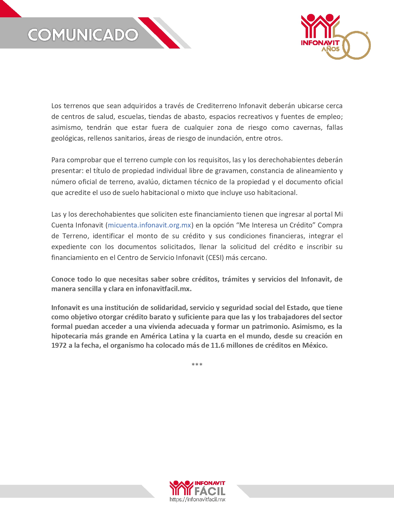 Con el nuevo crédito para terrenos, los trabajadores podrán adquirir de forma individual un terreno con uso habitacional o mixto que incluya uso habitacional a través de diferentes opciones de crédito: Infonavit Total o Crédito Infonavit.
