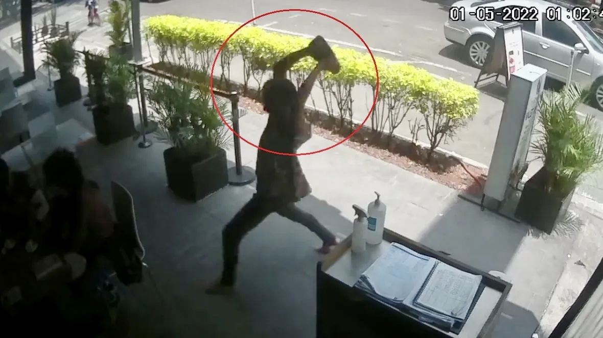Cámaras de seguridad del establecimiento captaron el momento en que un hombre ingresa al local con una enorme piedra en ambas manos y la arroja hacia la cabeza del menor.