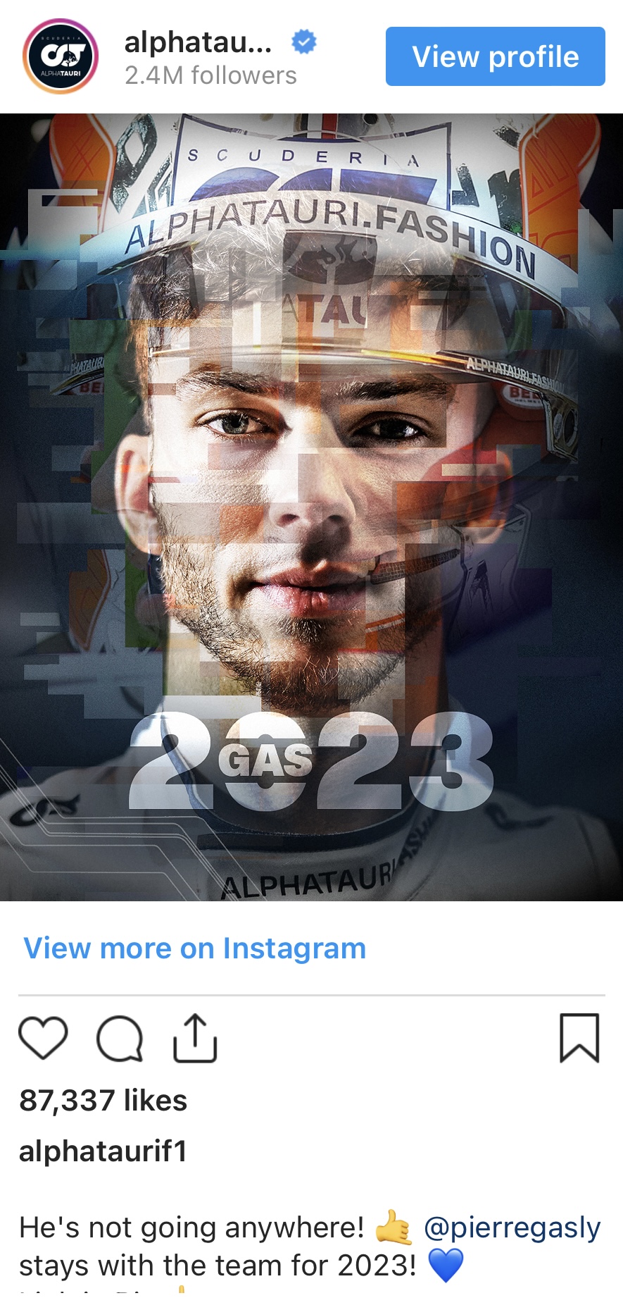 Gasly fue ascendido en 2019 a Red Bull pero la escudería austríaca, juzgando que el rendimiento no estaba a la altura, no le dejo tiempo y bajó al francés a Toro Rosso (antiguo nombre de AlphaTauri) a mitad de temporada. Desde entonces, Gasly ha logrado una victoria durante el Gran Premio de Italia 2020. También ha subido al podio en dos ocasiones, en Brasil-2019 y en Azerbaiyán-2021, en 95 Grandes Premios desde 2017. Según Franz Tost, su jefe en AlphaTauri, “forma parte del grupo de los mejores pilotos de F1”.