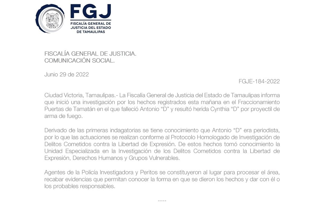 La Fiscalía General de Justicia de Tamaulipas informó que se inició una investigación por los hechos registrados esta mañana en el Fraccionamiento Puertas de Tamatán, por lo que las actuaciones se realizan conforme al Protocolo Homologado de Investigación de Delitos Cometidos contra la Libertad de Expresión.
