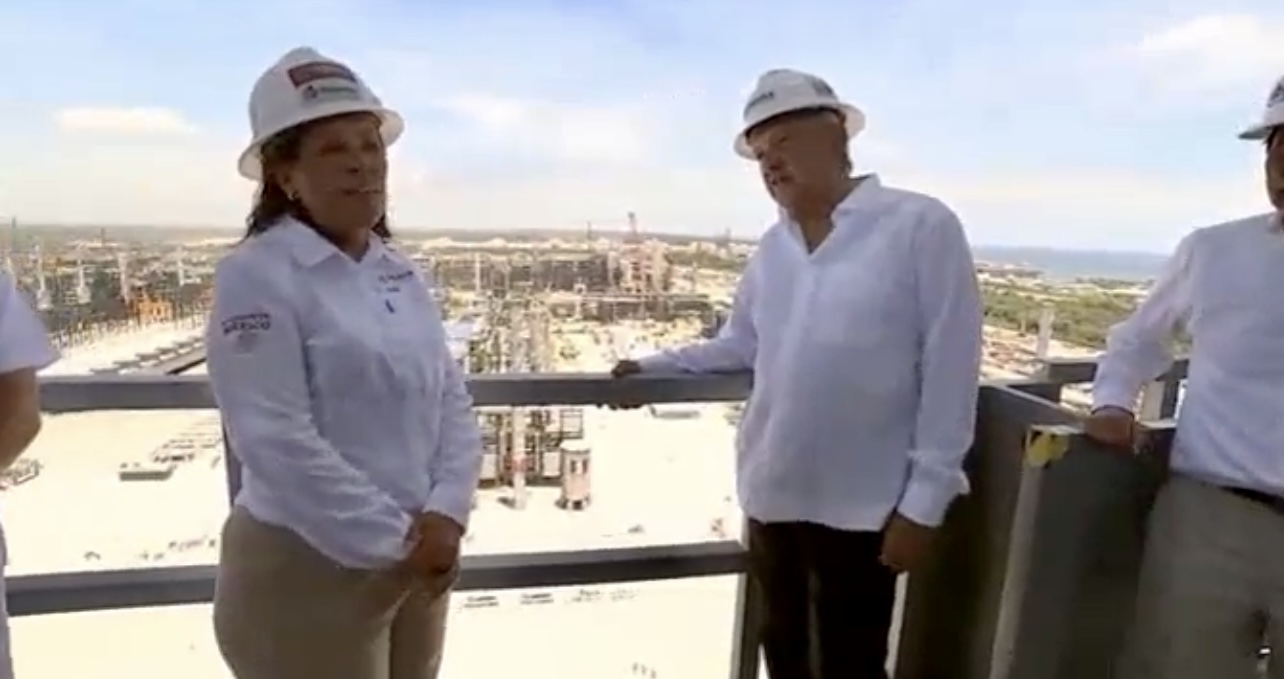 El Presidente López Obrador y esta comitiva efectúan un recorrido por las instalaciones de la nueva refinería, en el cual Rocío Nahle le informa los detalles de la obra.