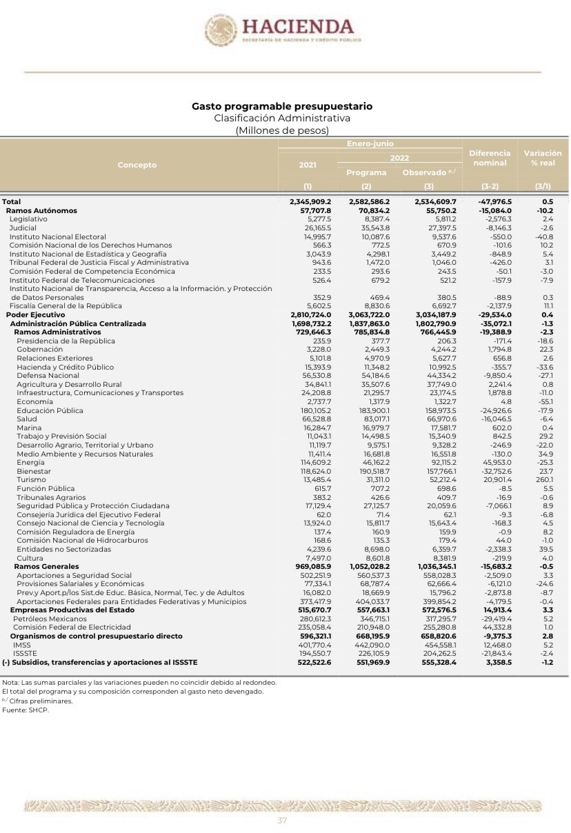 “Los ingresos presupuestarios del sector público sumaron 3 billones 305 mil 119.5 millones de pesos, cifra superior en 4.9% real respecto al primer semestre de 2021”, se lee en el documento.