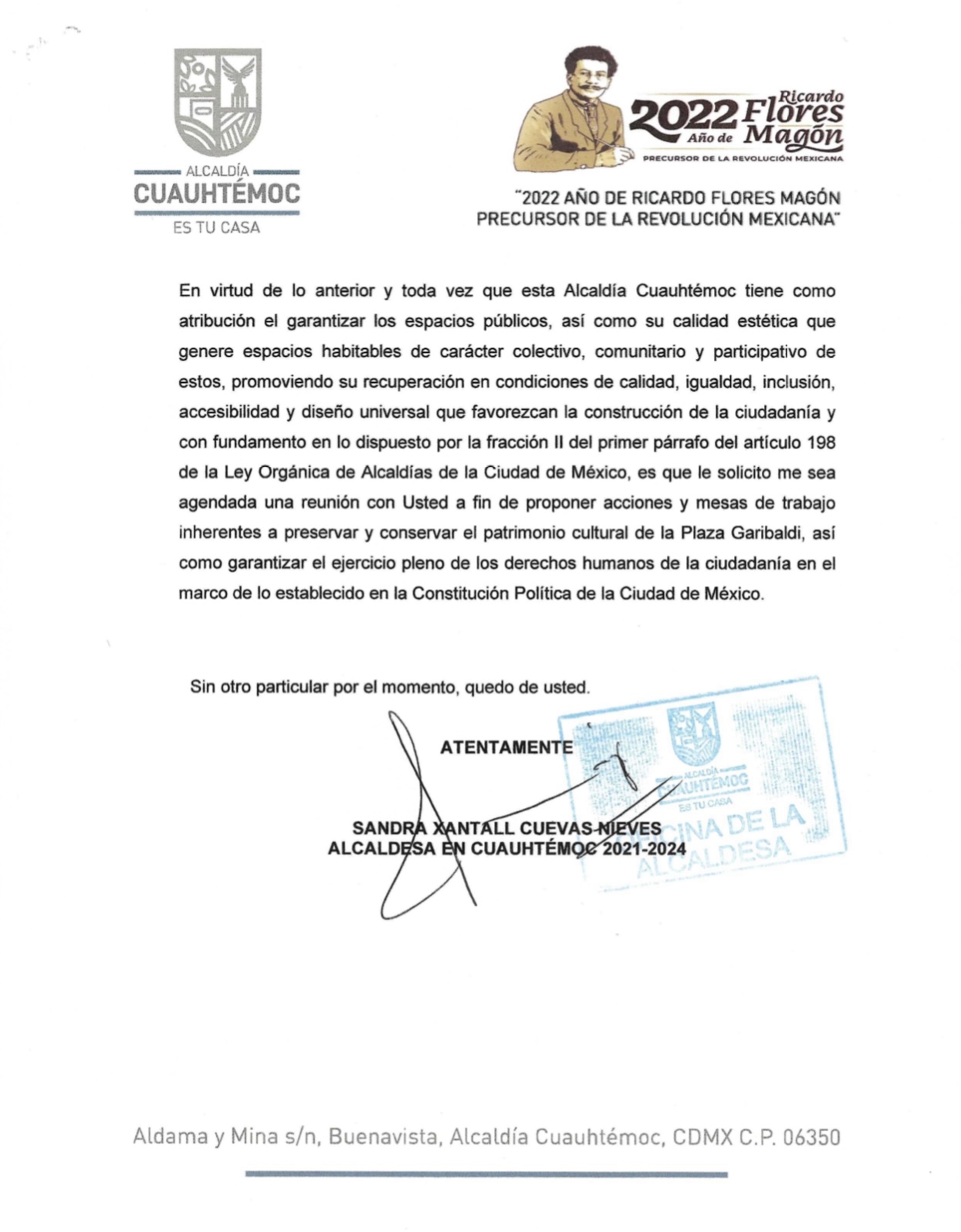 La Alcaldesa de Cuauhtémoc, Sandra Cuevas, agradeció a la Jefa de Gobierno de la Ciudad de México, Claudia Sheinbaum, su interés por la Plaza Garibaldi la cual inició su proceso de remodelación en Diciembre pasado con el cambio de administración en la Alcaldía por lo que la invitó a sumarse al Proyecto denominado Plaza Garibaldi Remodelación con Valor Cultural que encabeza y para lo cual le hizo un llamado a instalar mesas de trabajo para avanzar en la materia.