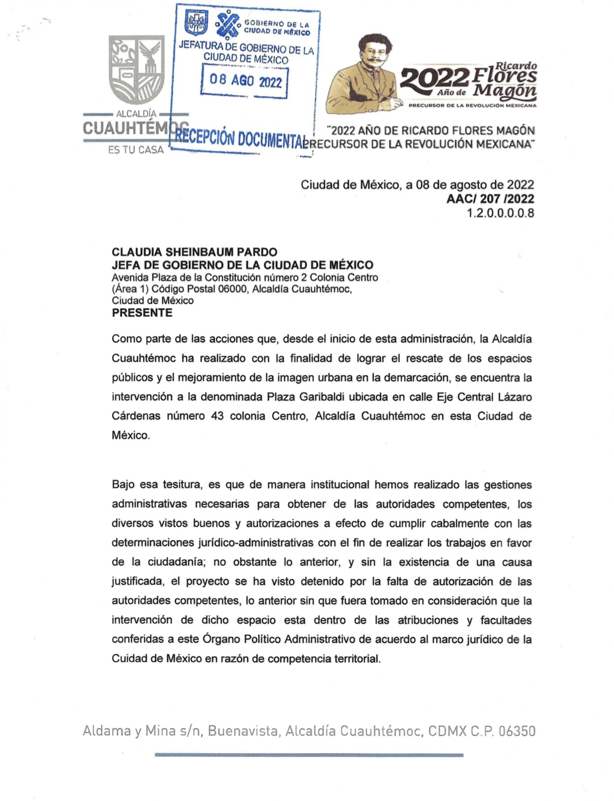 La Alcaldesa de Cuauhtémoc, ante los representantes de los medios de comunicación masiva expuso que a su llegada a la Alcaldía “tomo de bandera Garibaldi, que es un lugar emblemático, es un lugar declarado patrimonio inmaterial y material de la humanidad por la UNESCO y es ahí a donde el equipo de la Alcaldía Cuauhtémoc, mi gobierno entra para poder recuperar esta plaza tan importante”.