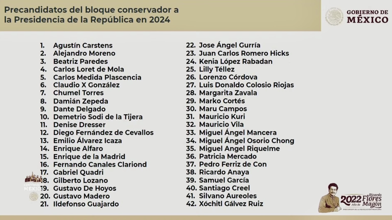 Pues vamos a dar a conocer porque son los que han expresado que quieren, han parecido en encuestas, o los han propuesto, para que vean cuántos hay del bloque conservador, dije que 38, pero salieron 42, de una vez vamos a destaparlos”, dijo.