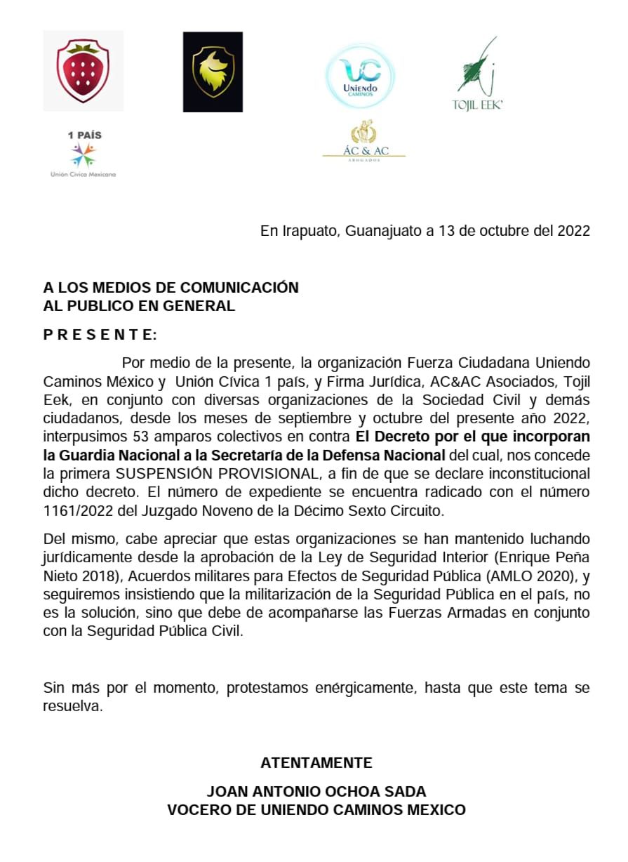 Un juez federal de Guanajuato otorgó a un grupo de organizaciones de la sociedad civil la primera suspensión provisional en los 53 juicios de amparo colectivos que interpusieron con el fin de que se declare inconstitucional el traspaso de la Guardia Nacional al Ejército.