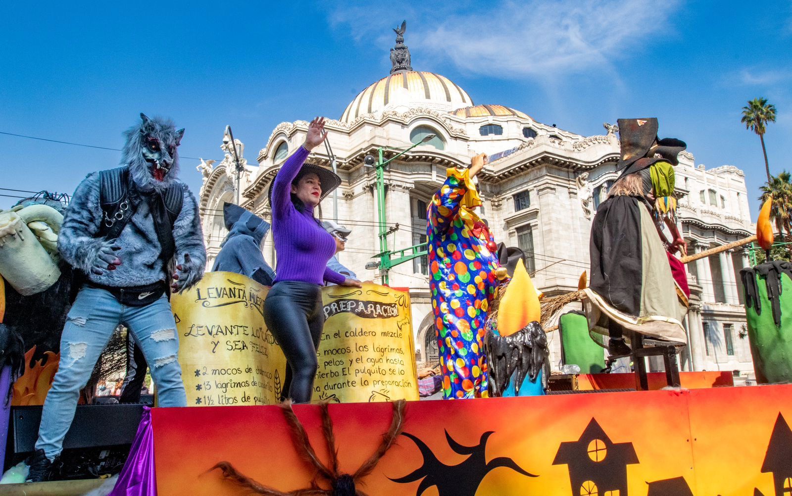 Con un espectáculo de color y música hizo vibrar a todos aquellos que disfrutaban su recorrido dominical por el primer cuadro de la ciudad pues vecinos así como turistas nacionales y extranjeros aprovecharon para tomarse la foto del recuerdo con el hombre lobo, la calabaza y la bruja.