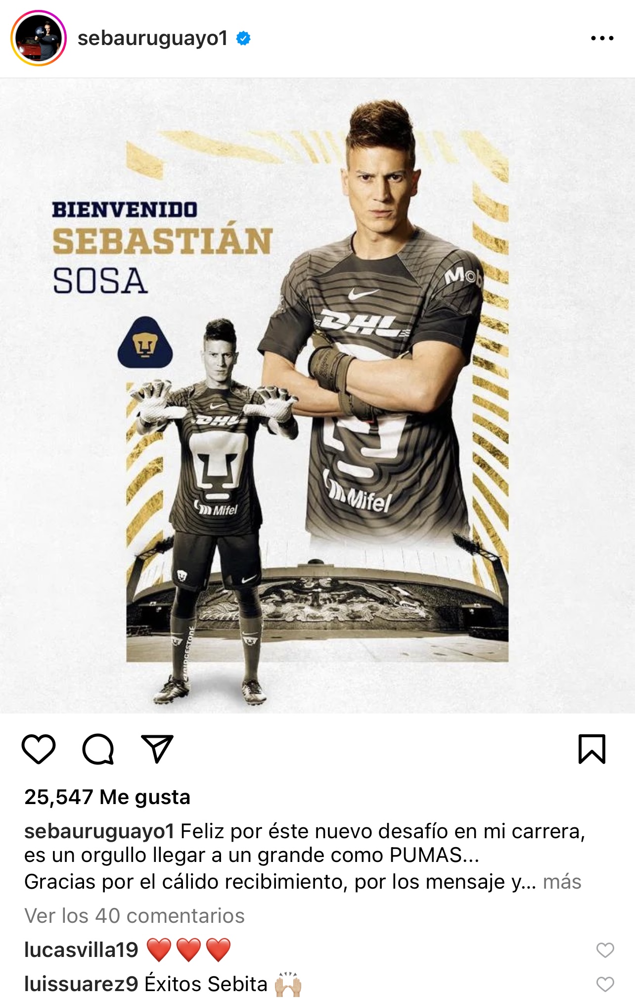 “Éxitos Sebita”, fue el mensaje que Suárez le colocó en la publicación de Instagram, por lo que no faltó el aficionado de Pumas que le pidió a Luis que también llegue a la UNAM. También su compañero en el arco de Uruguay, Fernando Muslera, le escribió por este nuevo reto para el jugador. “Vamoooo bestia, todo lo mejor”, le escribió el arquero que compartió vestidor en Qatar 2022 con Sosa. Ya tuvo el apoyo antes No es la primera vez que Sosa recibe mensajes de sus compañeros de Selección, pues cuando estaba en Qatar, en noviembre, tuvo que viajar a Montevideo por la muerte de su madre y el representativo suspendió entrenamiento por el duelo, y esperó el regreso de su jugador para concentrarse en el Mundial. Todos los jugadores le escribieron sus condolencias.