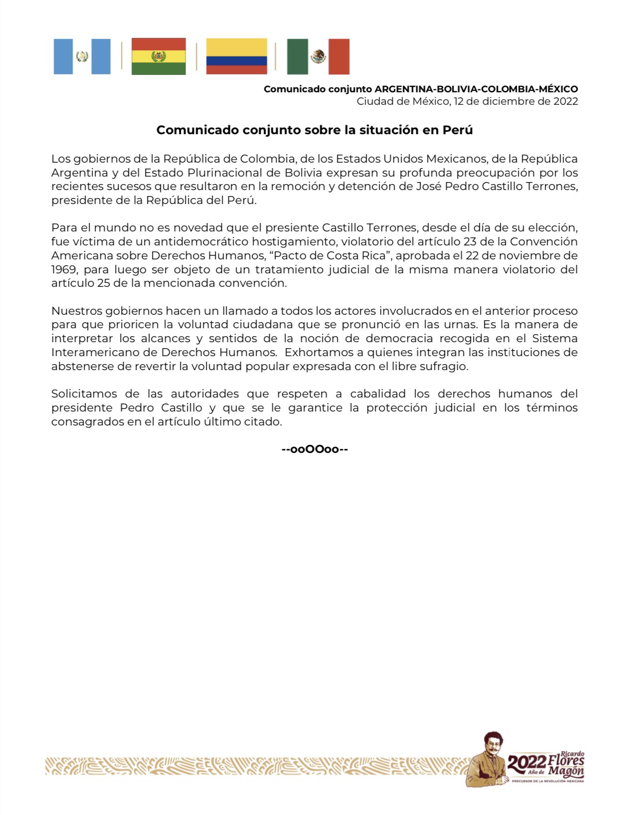 Los gobiernos de la República de Colombia, de los Estados Unidos Mexicanos, de la República Argentina y del Estado Plurinacional de Bolivia expresaron su profunda preocupación por los recientes sucesos que resultaron en la remoción y detención de José Pedro Castillo Terrones, expresidente de Perú.