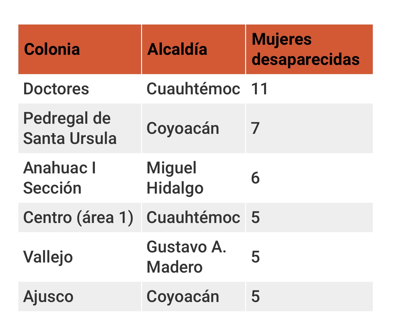La desaparición de mujeres en la Ciudad de México ha aumentado en los últimos años y aunque no ha sido tanta su visibilidad la denuncia de estos casos comienza generalizarse; sin embargo, para expertas en atender el problema es necesario entender que el fenómeno se focaliza; los datos indican que tres alcaldías en conjunto acumulan el 46% de los reportes de mujeres desaparecidas o no localizadas en la Ciudad de México durante 2022. Se trata de Iztapalapa, con 113 casos; Gustavo A. Madero, con 84 y Cuauhtémoc, con 58.