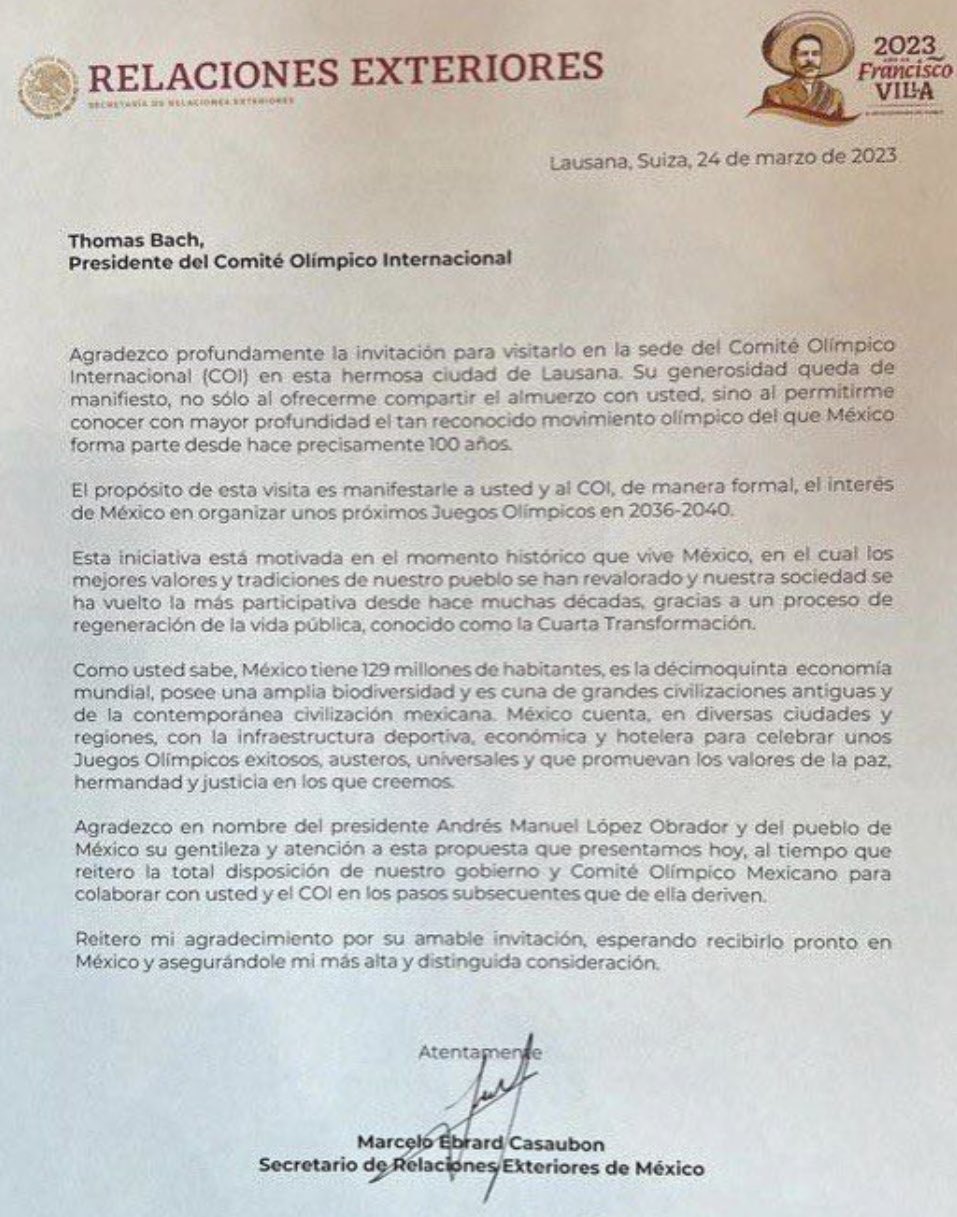El Secretario de Relaciones Exteriores Marcelo Ebrard, y la presidenta del Comité Olímpico Mexicano (COM) Mary José Alcalá, visitaron el Comité Olímpico Internacional (COI) para reunirse con su mandatario, Thomas Bach, y presentar de manera oficial una carta para postular a México como sede de los Juegos Olímpicos (JO) de 2036-2040.