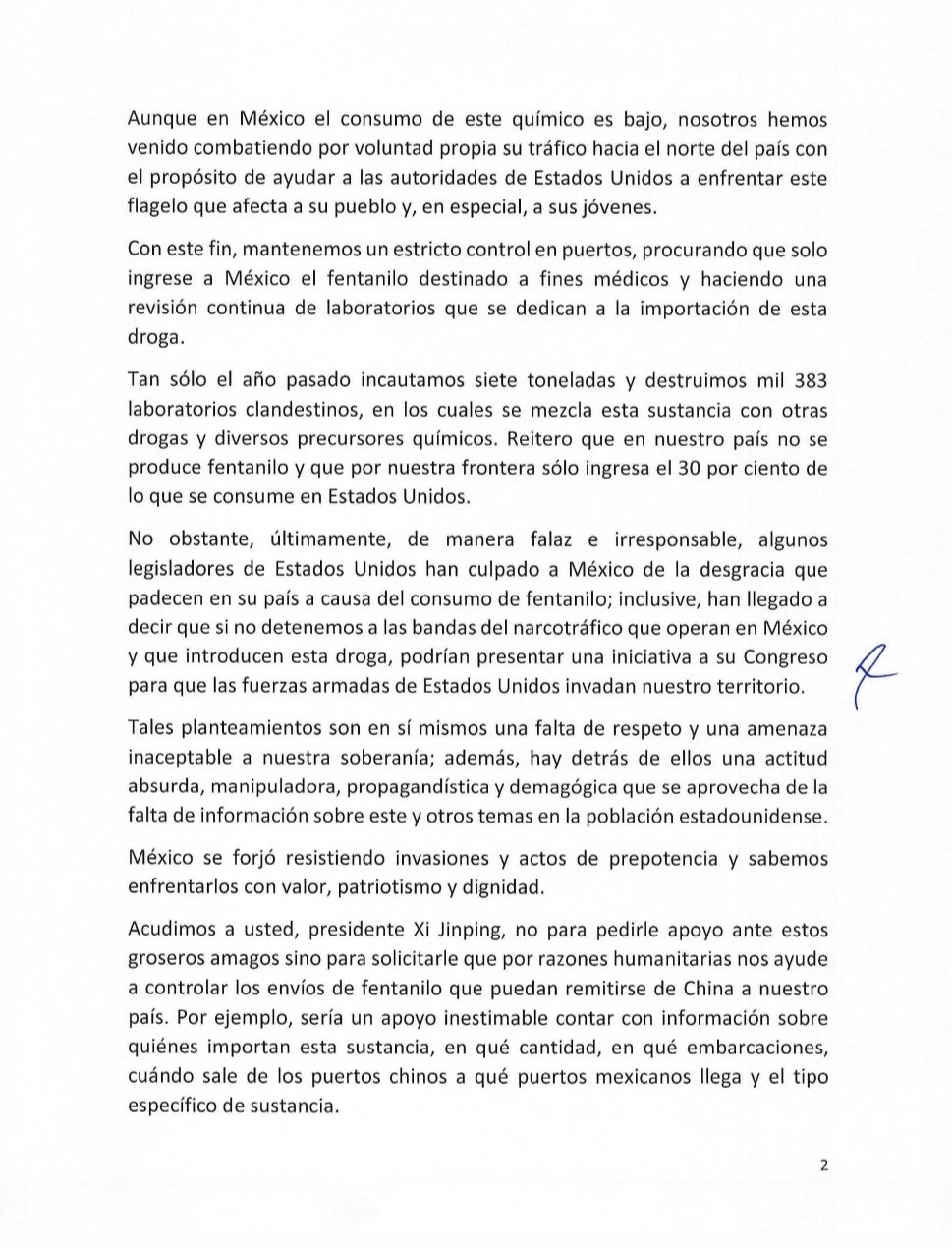 “Acudimos a usted presidente Xi Jinping, no para pedir apoyo ante estos groseros amagos, sino para solicitarle que por razones humanitarias nos ayude a controlar los envíos de fentanilo de China a nuestro país. Sería de un gran apoyo contar con información sobre quiénes importan esta sustancia, en qué cantidad, en qué embarcaciones, cuándo sale de los puertos chinos, a qué puertos llega y el tipo específico de la sustancia”, precisó la carta.