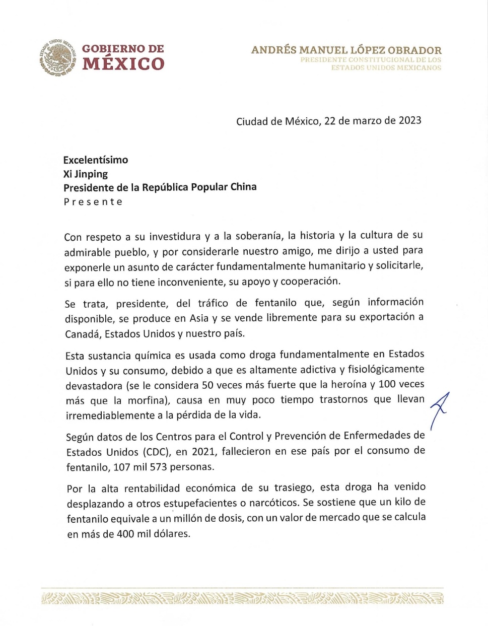 El presidente Andrés Manuel López Obrador envió una carta esta semana a su par de China, Xi Jinping, para solicitar ayuda y cooperación por razones humanitarias para controlar los envíos de fentanilo del gigante asiático a México.