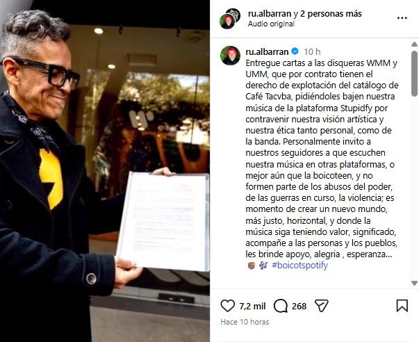 El músico invitó a los seguidores a escuchar a Café Tacvba en otras plataformas o incluso a “boicotear” Spotify, al considerar que es una forma de no participar “de los abusos del poder” y de “las guerras en curso”, además de llamar a “crear un nuevo mundo, más justo, horizontal” y en el que “la música siga teniendo valor” y “significado”.